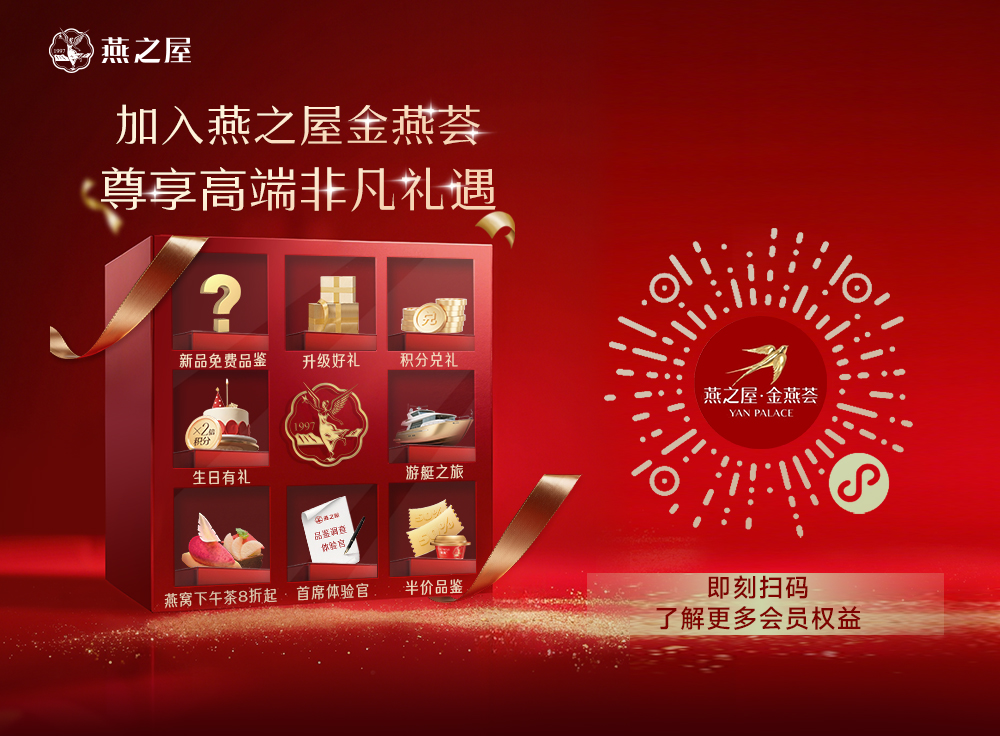 燕之屋企業(yè),27年專注高品質燕窩,為您提供專屬服務。 即刻掃碼,加入燕之屋金燕薈,開啟高端品質生活,為您定制更多專寵禮遇,享受專屬的尊貴體驗。